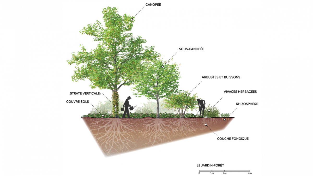 Le jardin-forêt s’appuie sur le modèle de la permaculture, reproduisant à l’identique les mécanismes de la nature sur une surface réduite afin de créer un jardin-potager, qui s’inspire de l’organisation naturelle d’un écosystème forestier. Autrement appelé forêt nourricière ou forêt comestible, ce type de plantation permet d’accumuler les ressources produites en abondance et sur le long terme. Écosystème dense, le jardin-forêt est construit sur plusieurs types de végétation : l’arborescent, les arbustifs et les herbacés. Constitué de multiples essences, il s’adapte parfaitement aux climats tempérés et permet d’établir un système autonome, constitué d’espèces sauvages et nourricières, qui s’inscrit dans la durée. On y retrouve donc les attributs de la forêt tels que des baies, des racines, des graines, des champignons, à l’échelle d’un plus petit espace.