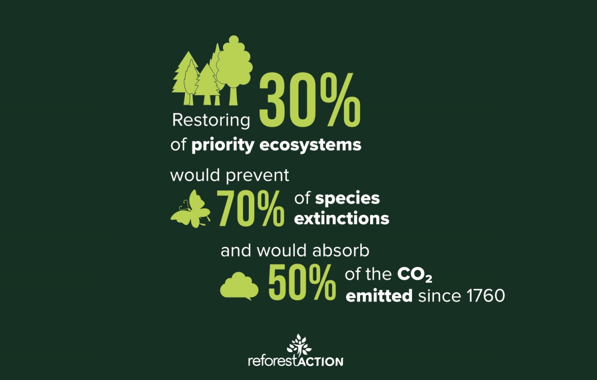 The results of this study are unambiguous: in addition to the crucial conservation of natural ecosystems that remain unscathed, restoring 30% of these priority areas would prevent more than 70% of species extinctions and absorb nearly 50% of the CO2 emissions that have accumulated in the atmosphere since the beginning of the 18th century’s industrial revolution.