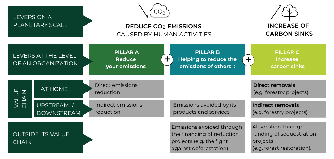 As an example, Carbone 4's NZI approach proposes that global action be applied at the company level. This approach invites each organization to consider three pillars on which it is necessary to act: reduce its emissions; help reduce the emissions of others; increase carbon sinks.