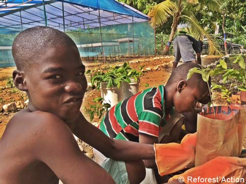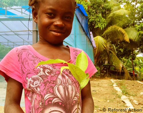 In this spirit, some children of Cabaret, a Haitian coastal town where our tree nursery is located, receive a tree to celebrate Earth Day on April 22. With gloves and small garden forks, each of the visitors took a young sapling out of the soil.