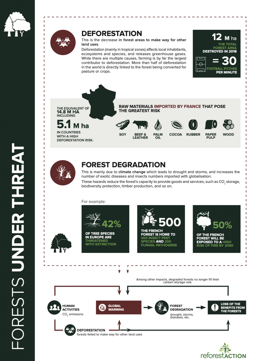 The forest is a common heritage, oh-so necessary for humanity but highly threatened. In spite of a collective awareness, tropical forests continue to be victims of intensive deforestation, mainly due to our consumption patterns. At the same time, forests in temperate zones are affected by hazards which are only increasing and directly linked to climate change. On the occasion of the "Forest Month", learn more about the two main types of threats facing the world's forests.