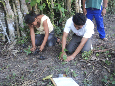 The reforestation technique is different than in Peru. This season in Guatemala, seeds are directly sowed in the fields. The direct seeding process is very similar to the way farmers plant beans and corn, they use a tool called a pioche (pickaxe) or chuza (stick) to plant two maya nut seeds per hole in a series of very shallow holes they make with the tool.