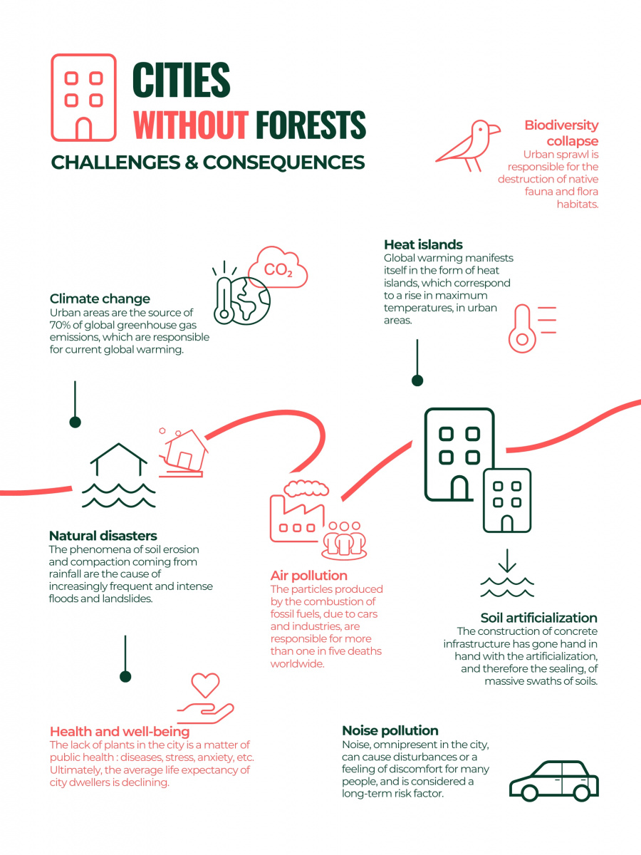 By 2050, there will be between 6 and 7 billion* city-dwellers on the planet, i.e. nearly 70% of the world's population. In France, this percentage will soon reach 80%**. Little by little, the size of the cities is increasing and metropolises with more than one million inhabitants are multiplying. Such a volume and such a concentration of people imply managing space and the environment in a way that is incompatible with nature. In most cases, the rapid expansion of cities has taken place at the expense of ecosystems. At the same time, urban sprawl, via the construction of concrete infrastructure, has gone hand in hand with the artificialization - and therefore the sealing - of massive swaths of soils, which is one of the proven causes of climate change and the erosion of the biodiversity.