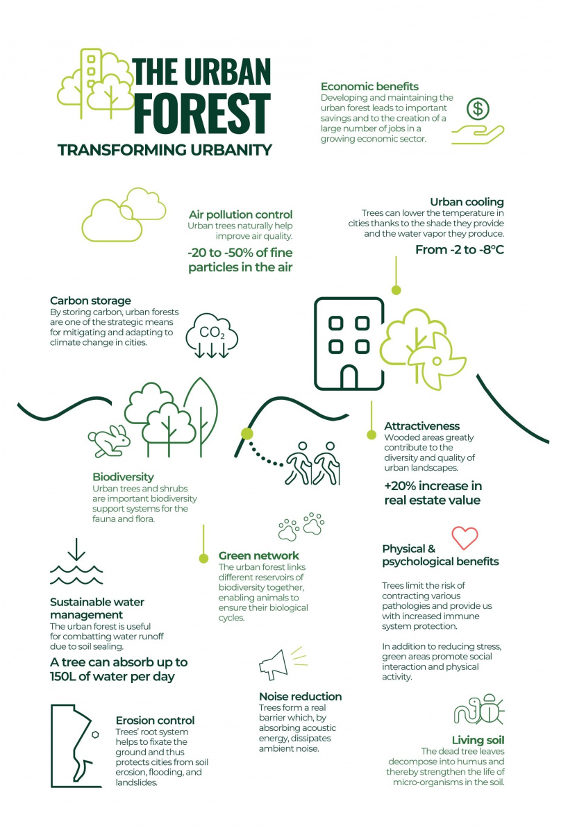 Wooded areas greatly contribute to the diversity and quality of urban landscapes, thereby enhancing their attractiveness to residents and visitors. The different categories of afforestation make it possible to remedy the monotony of “all concrete” while structuring the multiple spaces that make up the city. With its variety of colors, scents and shapes, the beauty of trees attracts and captivates.