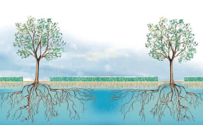 Les racines des arbres filtrent l’eau dans les profondeurs du sol, limitant la fuite des nitrates et de l’azote dans les nappes phréatiques. La présence d’arbres sur les terres arables améliore ainsi la recharge des nappes phréatiques et régule le cycle de l’eau.