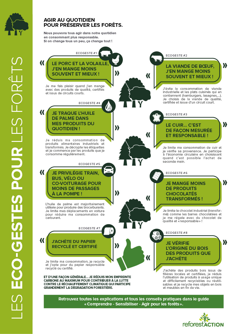 Pour répondre à nos besoins alimentaires et soutenir nos modes de vie, la France doit importer des matières premières agricoles et forestières, cultivées hors de nos frontières. Sept de ces matières importées (soja, huile de palme, cacao, boeuf, pâte à papier, bois et caoutchouc) représentent à elles seules près de 15 millions d’hectares de culture, situés pour plus d’1/3 dans des pays à risque élevé de déforestation. La demande liée à nos modes de consommation contribue à pousser les exploitations hors de nos frontières à s’étendre toujours plus et peut entraîner de la déforestation. Mais ce n’est pas une fatalité ! Nous pouvons tous agir dans notre quotidien. Agir pour les forêts c’est être plus conscient de ce que l’on achète, consommer moins et mieux en privilégiant les modes de production qui ne génèrent pas de déforestation.