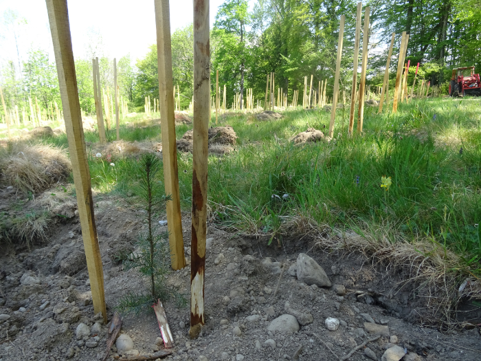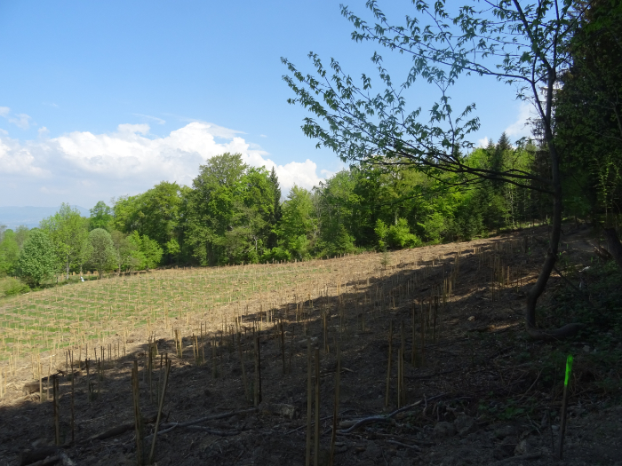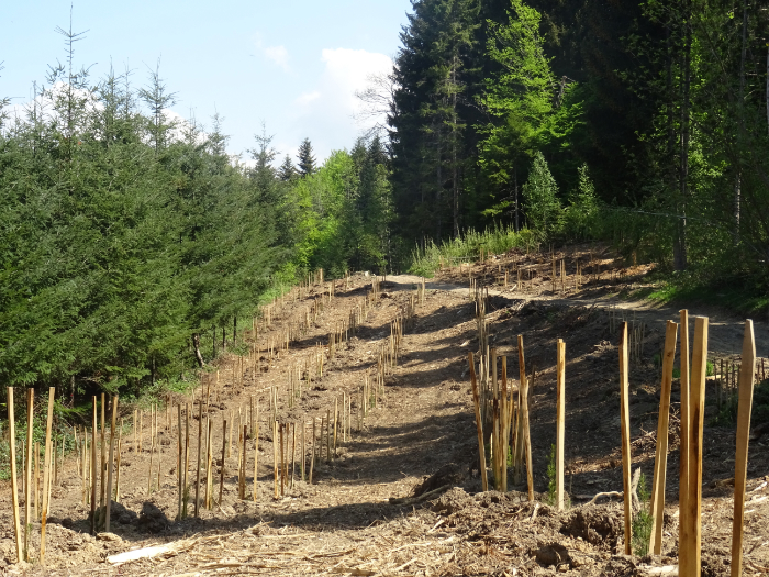 Pour ce faire, un mélange de deux essences (feuillus et résineux) a été choisi, à savoir du châtaignier et du douglas. Les plantations ont été réalisées manuellement en avril 2020, après un travail de la terre, puis la mise en place de protections contre l’appétit du gibier.