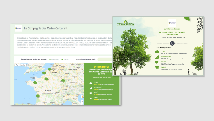 En compensant votre empreinte carbone via notre calculateur, votre entreprise bénéficie d’outils vous permettant de valoriser votre démarche. A l’issue du paiement en ligne, vous recevrez un certificat officiel attestant de votre engagement. Par ailleurs, une page personnalisée à vos nom et couleurs affichera votre forêt qui pousse durablement et les bénéfices associés.
