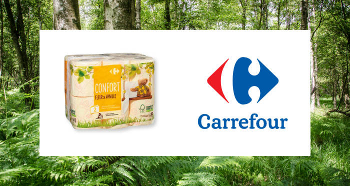 Pour célébrer la certification FSC de 100% des produits de sa gamme de papier toilette et sensibiliser ses clients et collaborateurs aux enjeux forestiers, Carrefour France s’est engagé en avril 2018 à planter un arbre avec Reforest’Action à chaque lot de papier toilette vendu.
