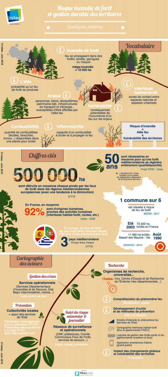 Selon l’IRSTEA (Institut national de recherche en sciences et technologies pour l’environnement et l’agriculture), la température moyenne a déjà augmenté de 2,5°C dans les 15 départements du sud-est de la France, contre 0,9°C ailleurs dans le monde. Le climat, plus chaud et plus sec, favorise ainsi les départs de feux, et ces feux relâchent, en retour, de grandes quantités de carbone dans l'atmosphère, qui viennent contribuer plus encore à l'effet de serre et renforcer le réchauffement climatique…