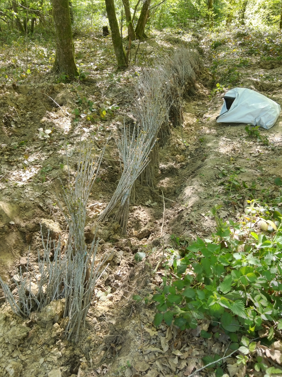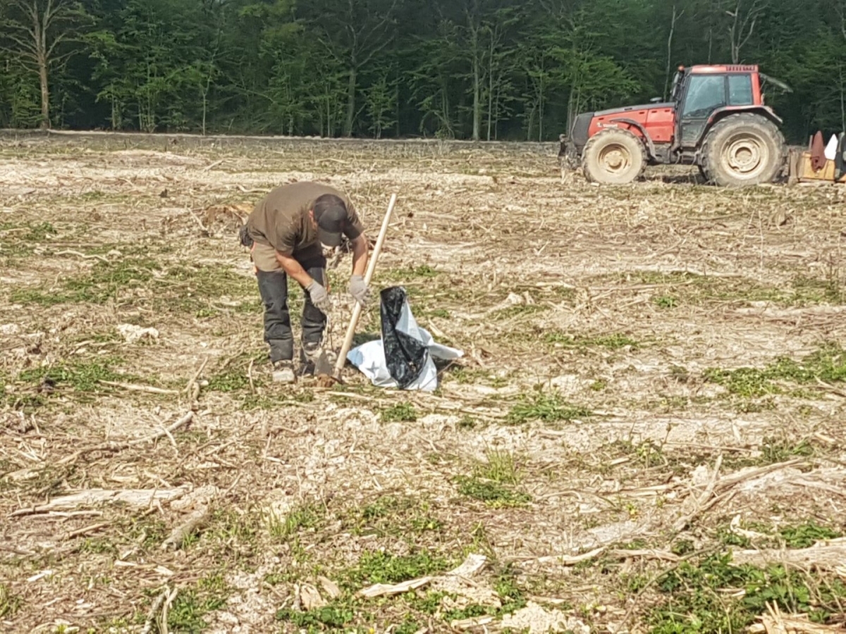 Après une préparation du terrain (broyage, sous-solage), les arbres (chêne sessiles, merisiers…) ont pu être plantés et protégés de l’appétit de la faune sauvage. Un vieux hêtre a également été conservé au milieu de la plantation pour des raisons historiques. Il veille sur les jeunes pousses qui viennent d’être plantées.
