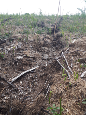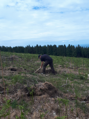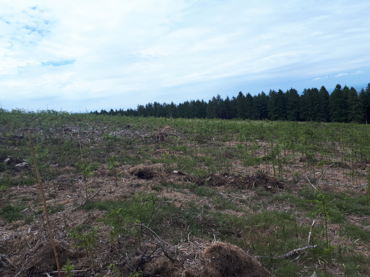 Les souches et rémanents de la parcelle ont dans un premier temps été broyées à l’aide d’un broyeur lourd. La parcelle a ensuite été sous-solée à l’aide d’un bulldozer afin de créer des sillons de plantation permettant une meilleure reprise. Les jeunes plants ont ensuite été plantés à la pioche.