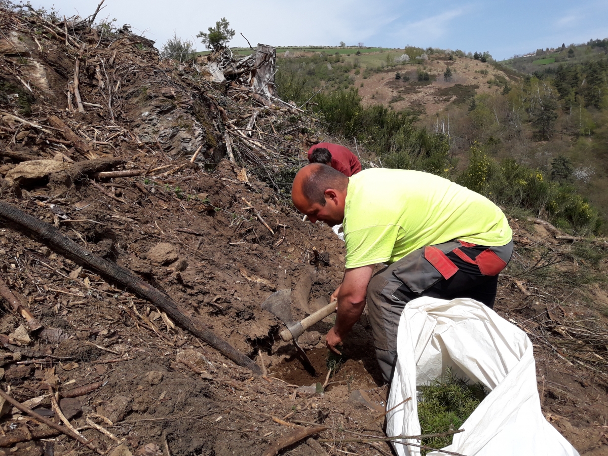 Le terrain a d'abord été préparé a l'aide d'une "pelle araignée » pour dégager la végétation présente, puis ameublir les emplacements de plantation. Les planteurs ont ensuite mis en place les plants dans les emplacements préparés préalablement en veillant a bien tasser la terre pour éviter les poches d'aires autour des racines.