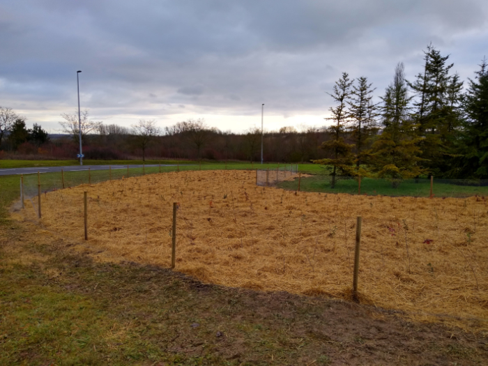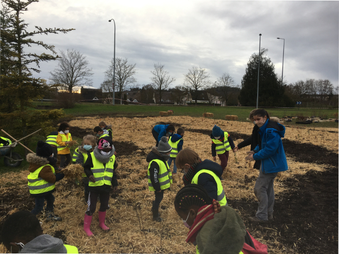 Un paillage a enfin été mis en place afin de protéger le sol et les plants des aléas (gel, soleil l’été, érosion du sol). La paille permet également de maintenir l’humidité et améliore donc la disponibilité en eau !