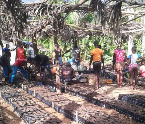 A Anse d'Hainault, petite ville de la bande sud d’Haïti, 10 000 cacaoyers ont été mis en pépinière ce mois-ci. Les habitants du village, enfants et adultes, se sont joints à notre partenaire Kaléos pour participer ensemble à cette activité festive.