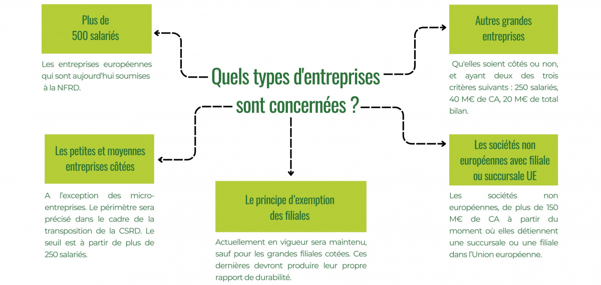 - Les entreprises européennes qui sont aujourd’hui soumises à la NFRD : les grandes entreprises de plus de 500 salariés.