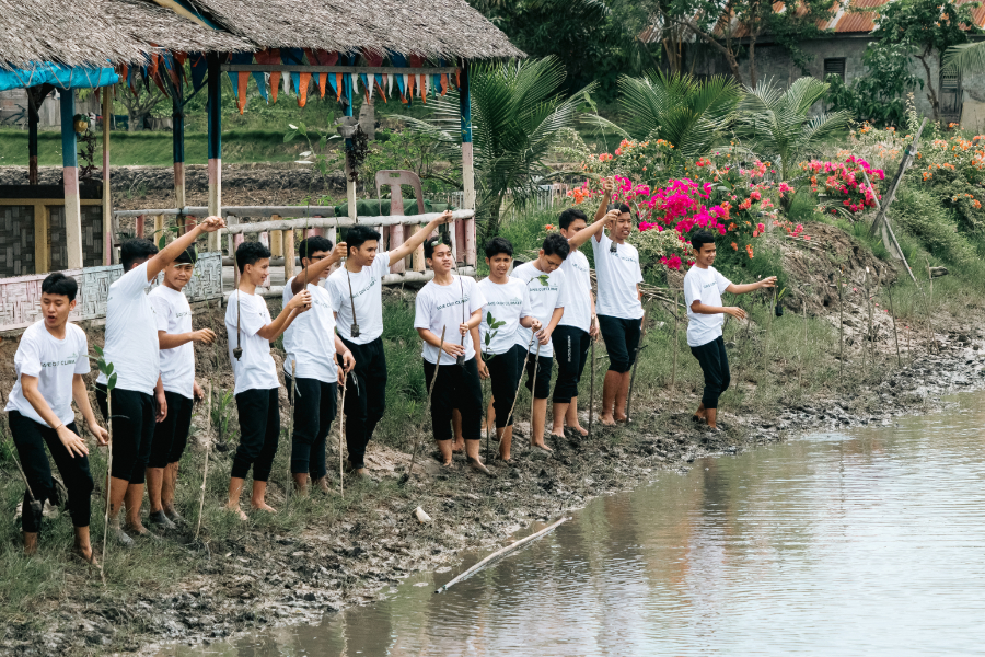 A Dogang, quelques jours plus tard, une journée de sensibilisation à la prévention des catastrophes naturelles est organisée pour les étudiants du lycée Al-Azhar de Medan. Aux discours des professeurs et des intervenants de Yakopi et de Reforest’Action, qui développent les qualités de barrière naturelle de la mangrove contre les aléas climatiques, se couple un atelier de plantation de palétuviers. Pieds nus sur le sol glissant, les lycéens apprennent à enfouir la longue tige ligneuse des palétuviers jusqu’à ce que celle-ci s’enracine dans la vase.