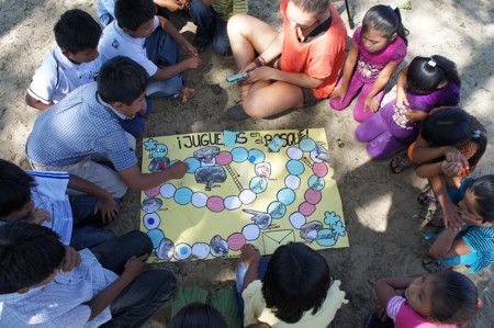 Anika a fait jouer les enfants à une sorte de jeu de l’oie en plein air appelé Conocer al Bosque Seco (« connaître la forêt sèche »). Les enfants ont découvert les différents usages des ressources extraites de la forêt sèche et les bonnes pratiques pour la préserver, dont la R.N.A.