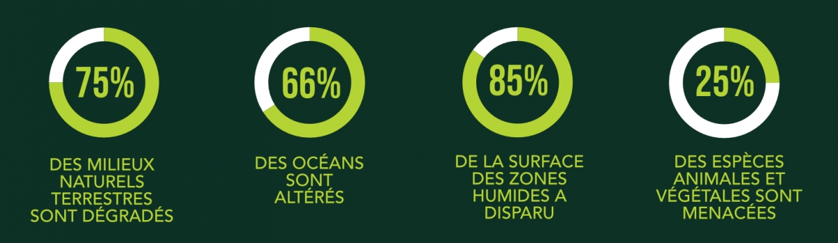 Dans la plupart des régions du monde, la Nature a aujourd’hui été altérée de manière significative par de multiples facteurs humains, et la grande majorité des indicateurs relatifs aux écosystèmes et à la biodiversité montrent un déclin rapide. Ainsi, l’IPBES estime qu’aujourd’hui :