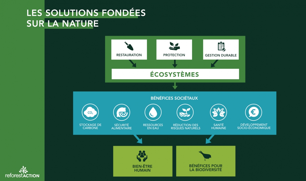 Reforest’Action s’appuie sur le concept des Solutions fondées sur la Nature en déployant des projets qui répondent au concept de restauration des paysages forestiers. Notre mission : préserver, restaurer et créer des forêts partout dans le monde pour développer dans la durée leurs multiples bénéfices environnementaux, sociaux et économiques. Aujourd’hui, nos 700 projets forestiers développés sur les 5 continents permettent à la fois l’amélioration de la biodiversité forestière et une plus grande captation de carbone qui contribue à l’atténuation du changement climatique. Les projets financés par Reforest’Action s’inscrivent ainsi au cœur de l’action climatique mondiale et des Solutions fondées sur la Nature.