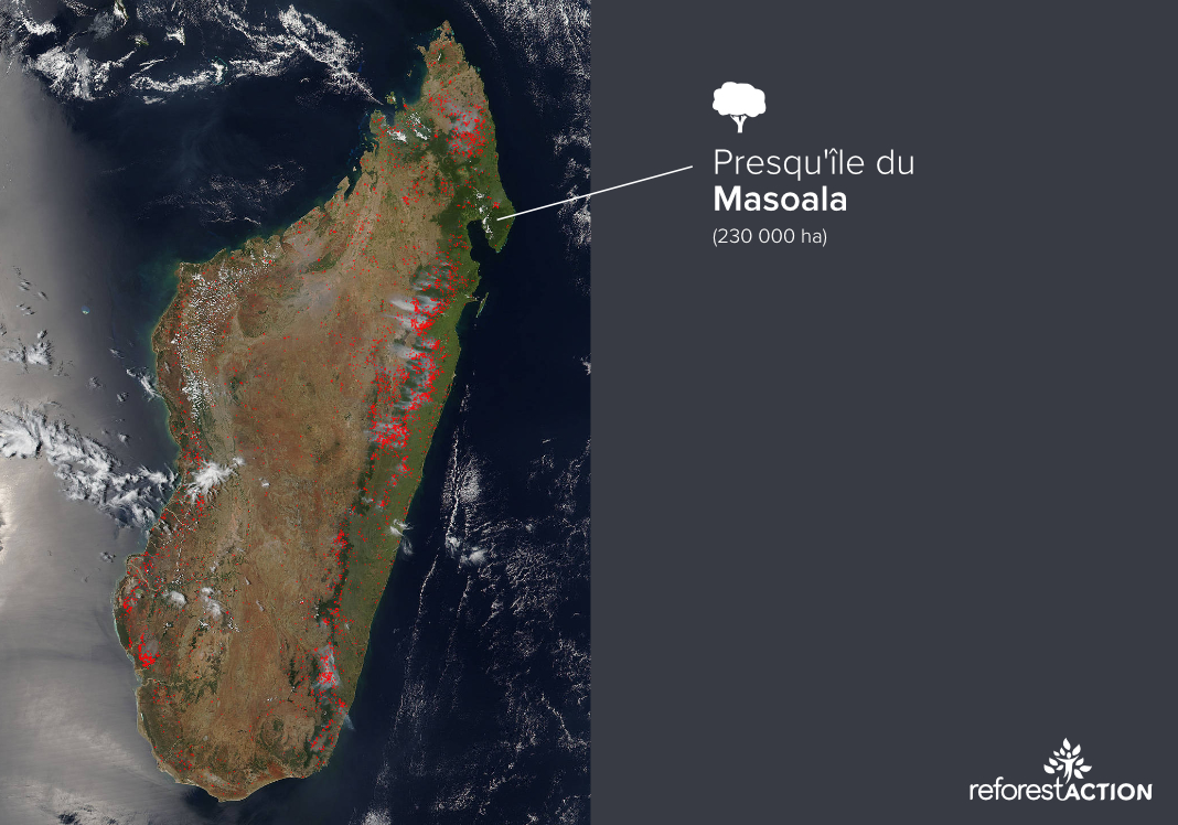 Extraordinairement riches en biodiversité, les forêts de Madagascar sont menacées par la culture sur brûlis. Cette pratique, longtemps encouragée par le gouvernement et ancrée dans les mœurs, vise à brûler une parcelle de forêt pour l’enrichir en azote avant l’installation de cultures vivrières. Notre projet de reforestation, conduit sur le terrain par notre partenaire Génération Masoala, permet aux habitants des environs d’Ambatobe, au nord-est de l’île, de développer l’agroforesterie pour concilier les arbres et les cultures, sans détruire les forêts. En prenant conscience de l’intérêt d’un couvert forestier et protecteur pour leurs cultures de maïs ou de manioc, et de la capacité des arbres plantés autour de leurs champs à enrichir les sols cultivés, les communautés locales se détournent de la pratique du brûlis. Depuis l’initiation du projet, la Brigade des feux a ainsi constaté une baisse considérable des feux de forêts au sein du Parc National du Masoala. Comme l'indique la carte de la NASA figurée ci-dessous, la presqu'île brille par la quasi-absence de feux par rapport au reste du territoire.