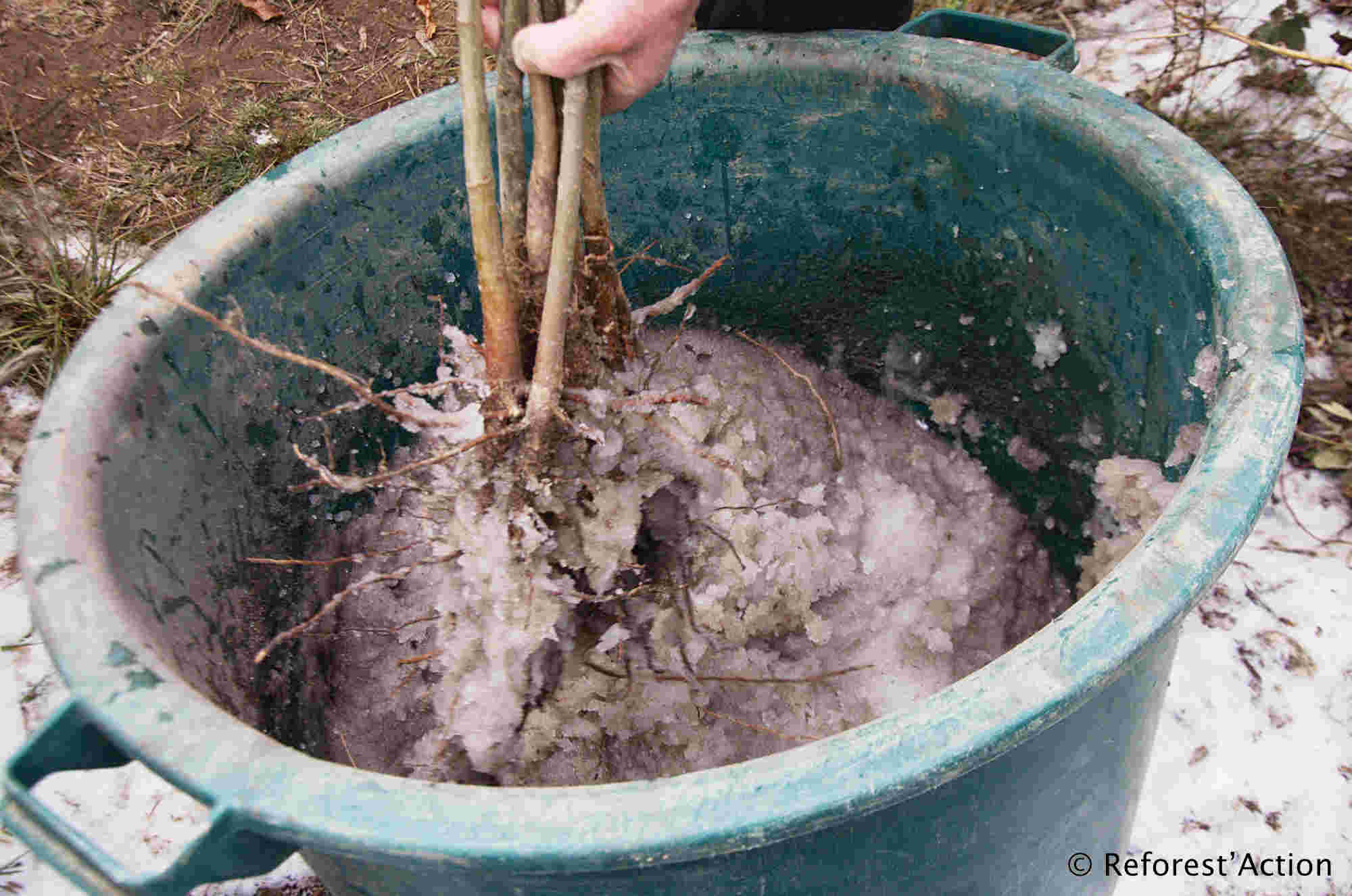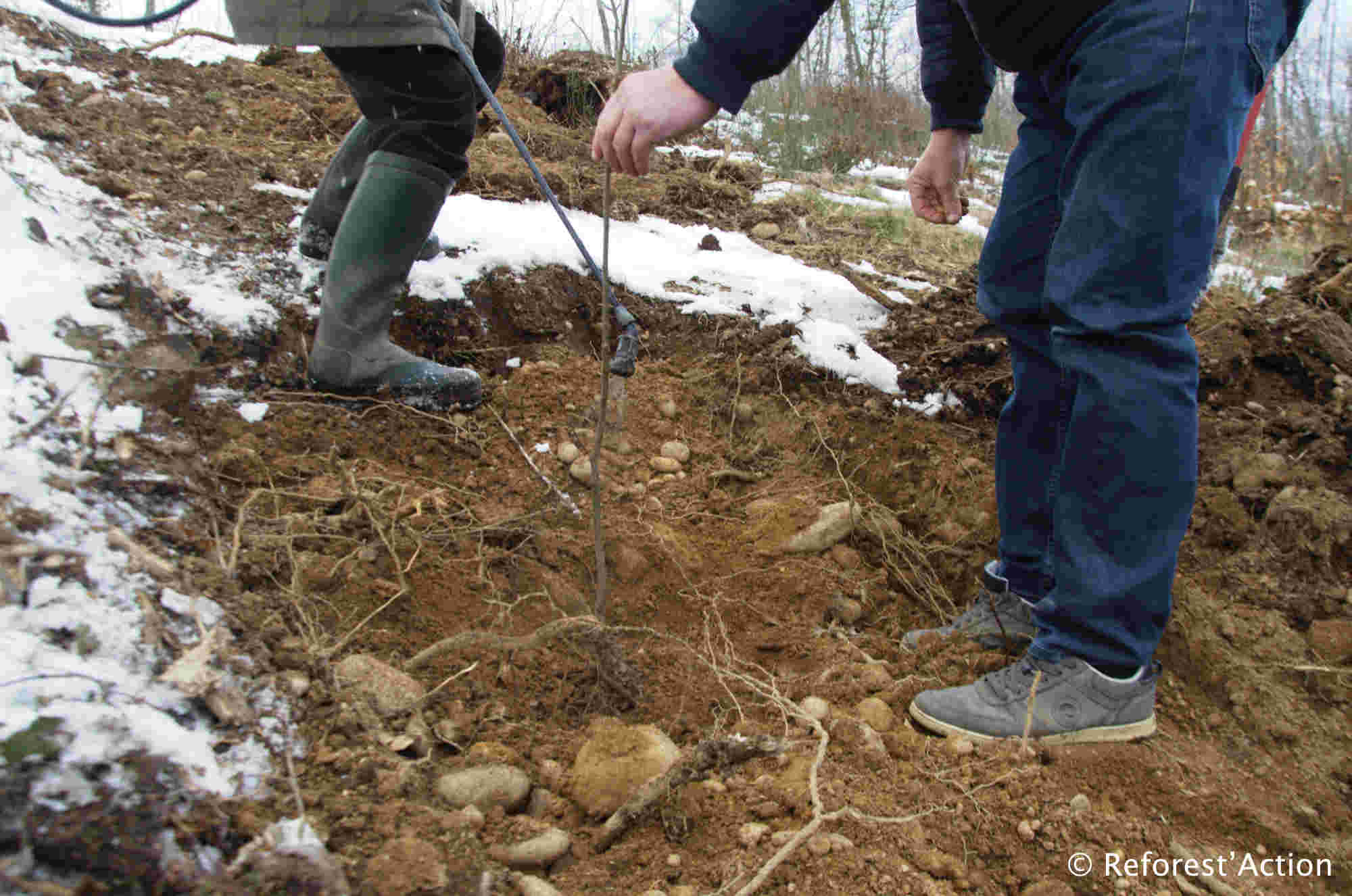 En partenariat avec le syndicat départemental de l’Ain de Fransylva, Reforest’Action a planté 1 000 chênes fin janvier à Châtenay (Ain) selon la méthode expérimentale de bio-dynamisation forestière. C’est la première fois en Europe que cette technique de plantation écologique et responsable est utilisée en milieu forestier ! Malgré la neige et le froid, une cinquantaine de planteurs étaient présents ce mercredi 25 janvier. Jean-Pierre Bouvard, Président de Fransylva Ain, Daniel Soupe, pépiniériste-biologiste à l’origine de la biodynamisation forestière, Cyrille Chaffard, maire de Châtenay, ainsi que des propriétaires forestiers de la région, ont rejoint l’équipe de Reforest’Action afin de mettre les jeunes chênes en terre. Technique expérimentale propre au milieu forestier, cette plantation d'arbres n'a pas de lien avec les principes de l'agriculture biodynamique imaginés par Rudolf Steiner. Dans un premier temps, les champignons mycorhiziens, utilisés pour favoriser la croissance des plants, ont été insérés dans une substance gélatineuse, afin de les conserver et de garantir leur adhérence optimale aux racines. Les racines des jeunes chênes ont ensuite été plongées dans la mixture.
