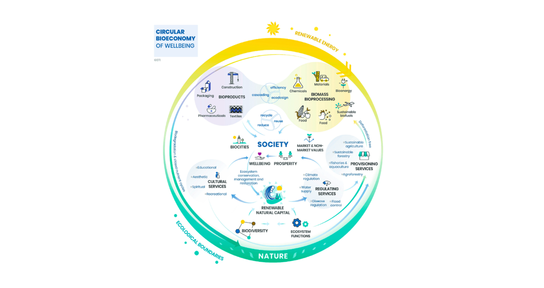 La bioéconomie circulaire repose sur des écosystèmes sains et résilients. Sa mission est d’assurer le bien-être grâce à des services écosystémiques et une gestion durable des ressources (plantes, animaux, micro-organismes et biomasse dérivée, y compris déchets organiques). Ceux-ci sont transformés de manière circulaire en denrées alimentaires, aliments pour animaux, énergie et biomatériaux - dans les limites écologiques des écosystèmes sur lesquels ils reposent.