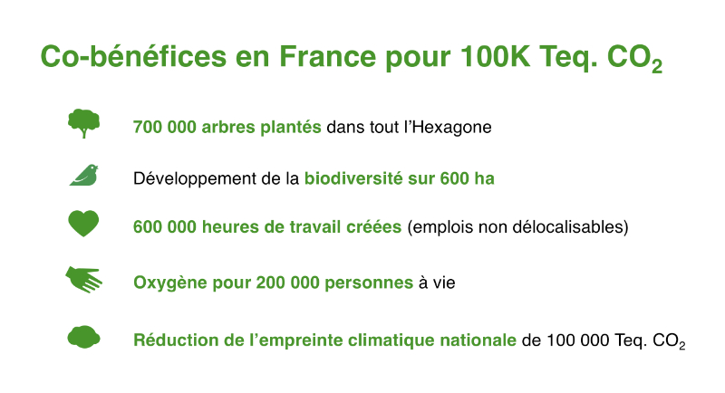 Grâce aux projets de reboisement en France contenus dans Reforest’Local, les entreprises génèrent une palette de co-bénéfices locaux pour leurs clients et collaborateurs. Reforest’Action mesure ces services environnementaux en matière de climat, santé, biodiversité et emploi que les entreprises valorisent ensuite.